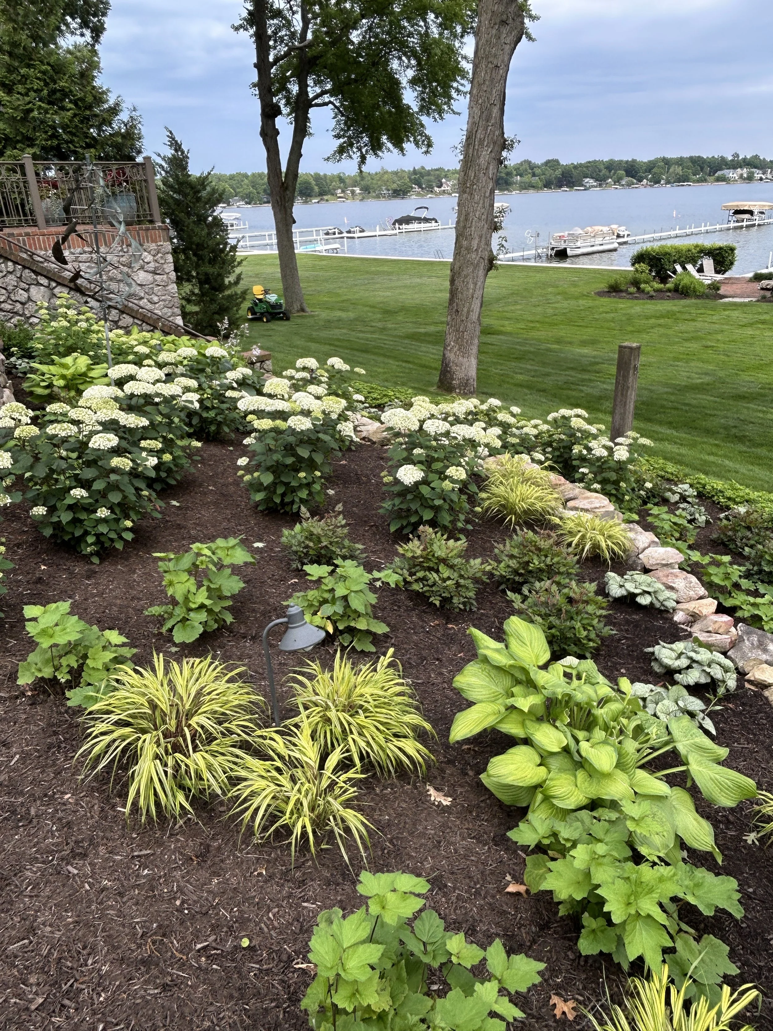 These landscapes highlight how layered plantings and stonework can transform both slopes and flat beds into stunning focal points. Along the lakeshore, a waterfall of Hydrangeas cascades down the hillside, softening the grade with clouds of white blooms that flow like water toward the shoreline.