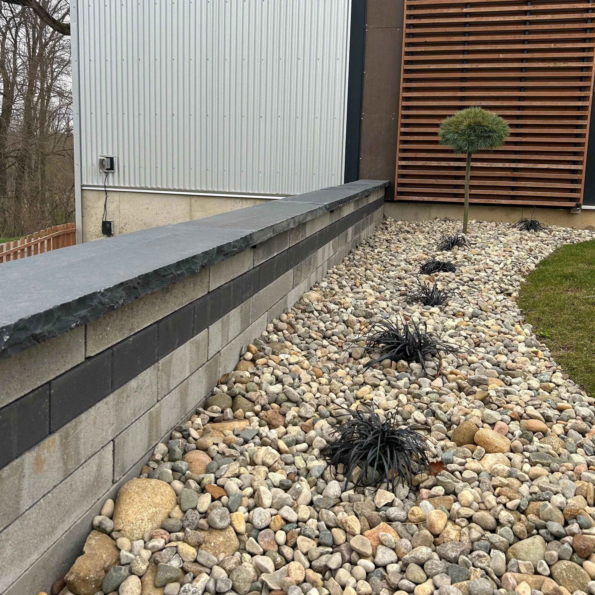 This landscape design blends natural and modern elements to complement the contemporary home. Along the stone retaining wall and entry steps, evergreen shrubs and conifers provide year-round structure, while heuchera, ferns, and hostas add seasonal color and texture. Boulders are used as accents, tying the plantings back into the rock wall, and ornamental grasses bring movement and softness. Clean mulch borders and decorative gravel give the space a polished, low-maintenance look. On the side of the house, a minimalist bed of river rock with repeating black mondo grass mirrors the home’s sleek lines and industrial finishes, while the wood screening and stonework add warmth and balance. The overall effect is a cohesive, modern landscape that feels both structured and inviting.
